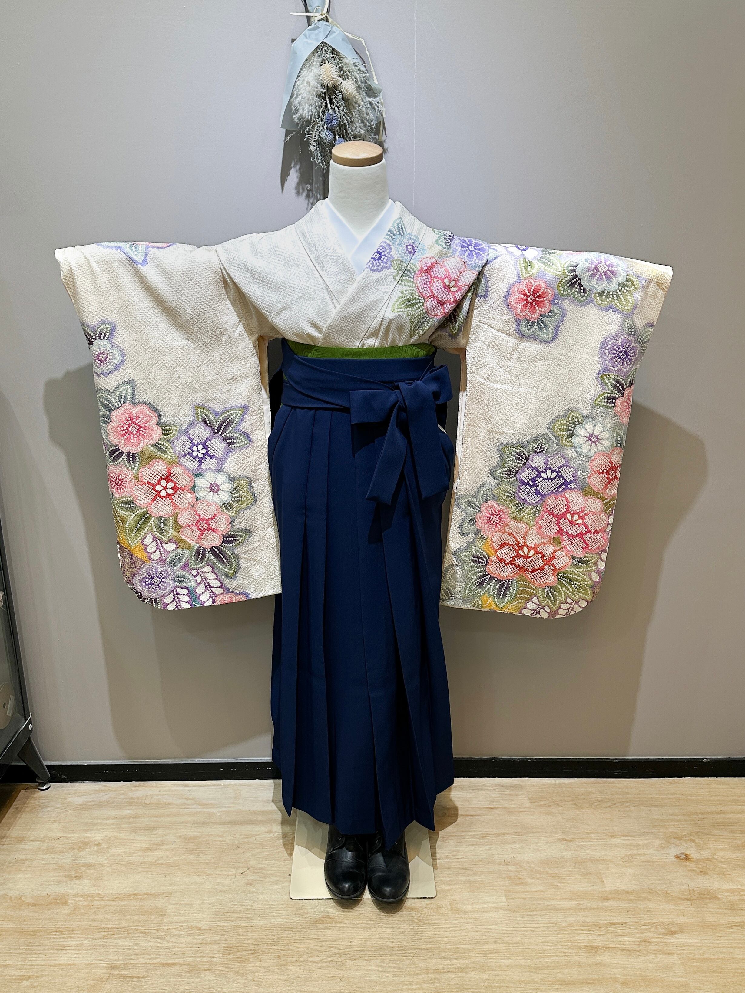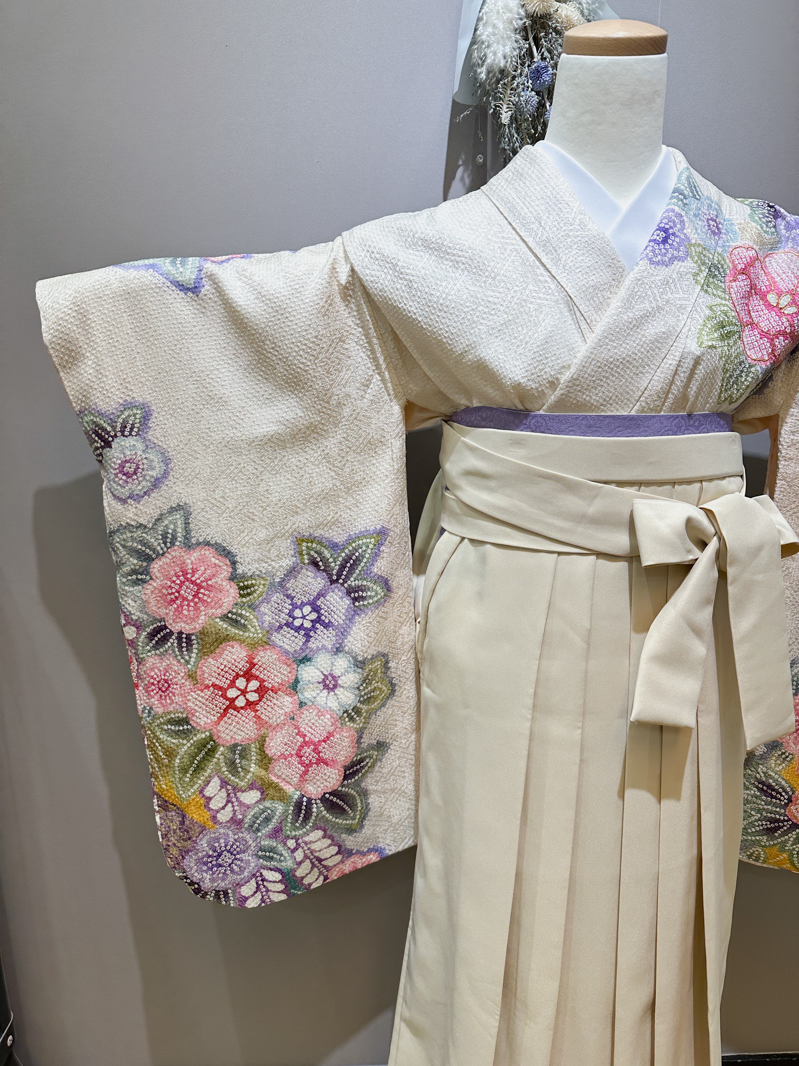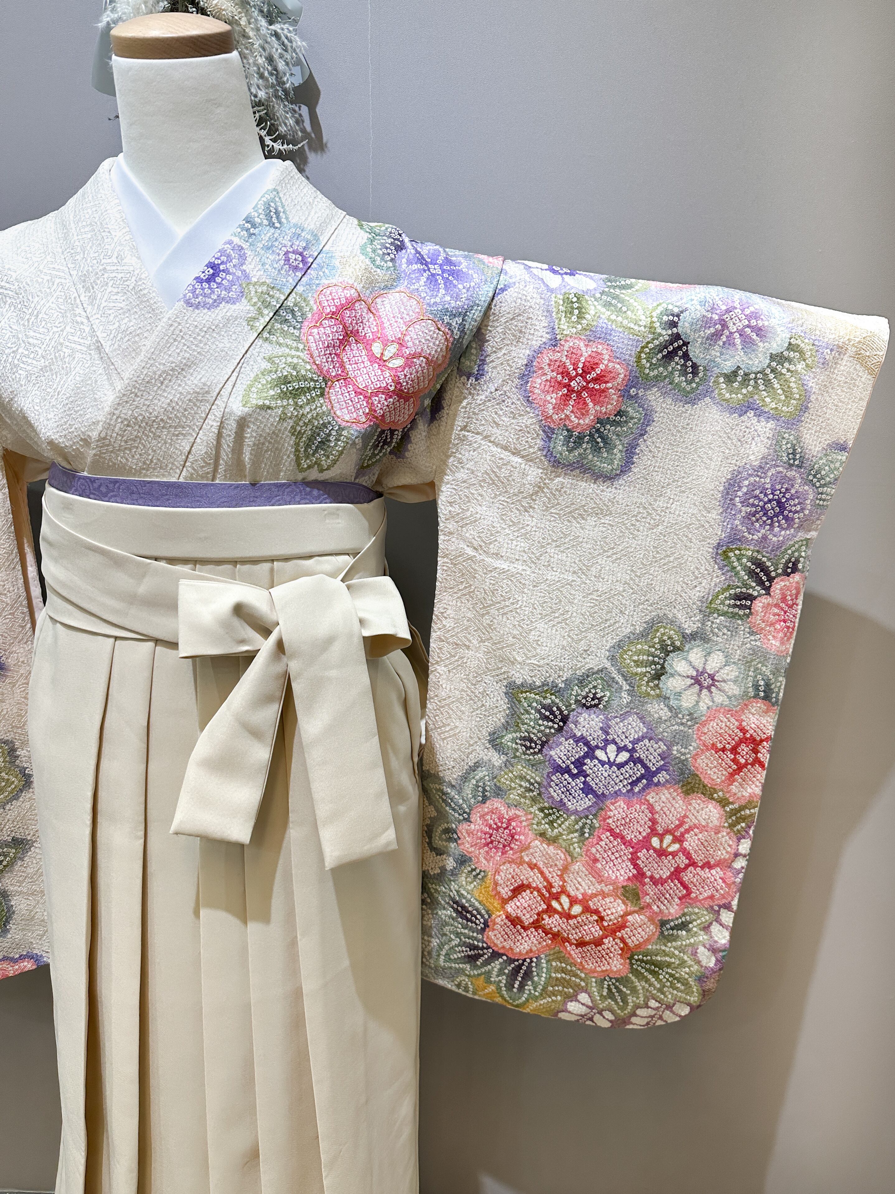白地の総絞りに優しい色合いの花々が描かれ、可愛らしさの中に高級感もあわせ持つF−38に、人気のアイボリー袴で色味を統一した清楚系コーディネート。