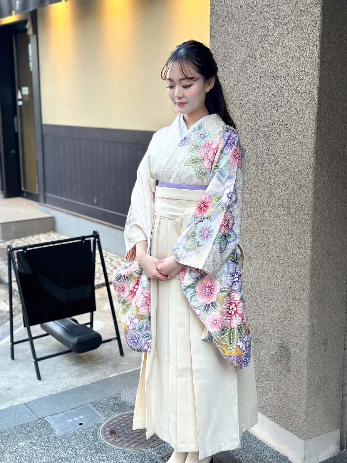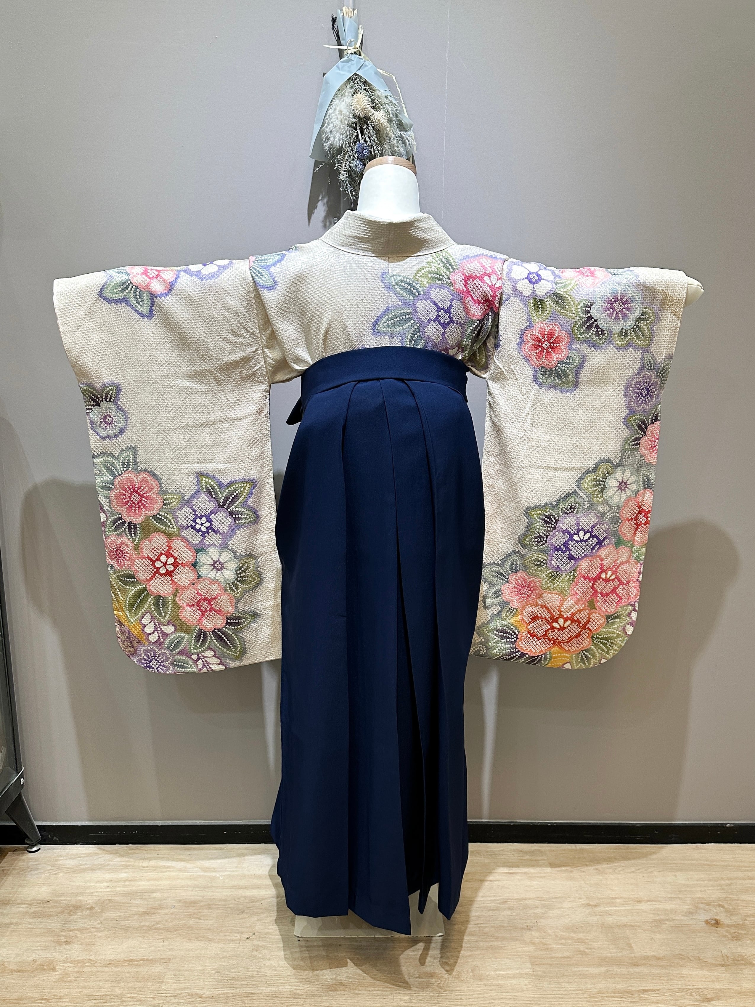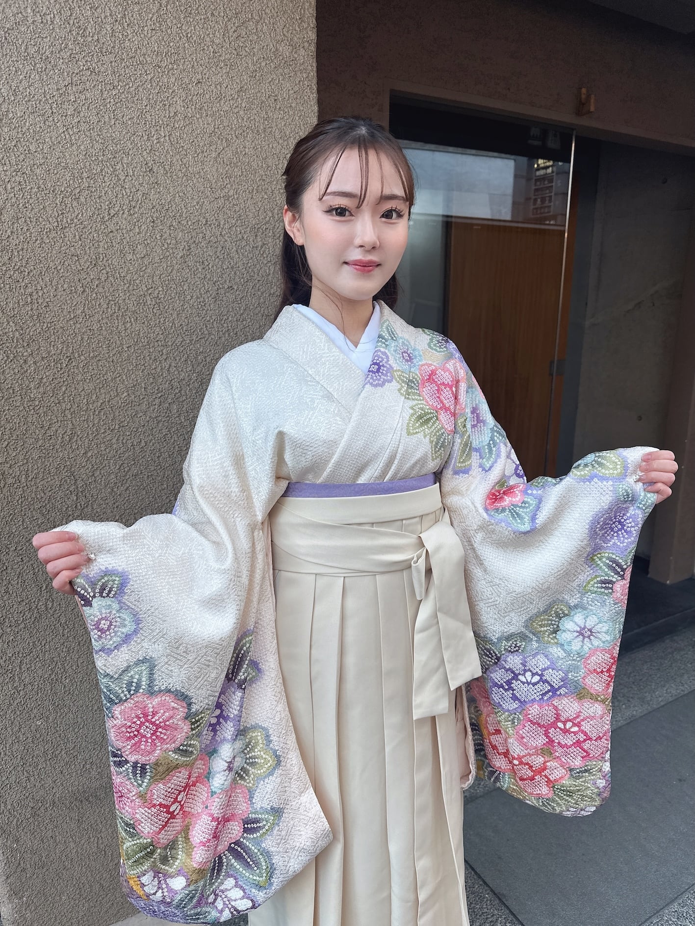 白地の総絞りに優しい色合いの花々が描かれ、可愛らしさの中に高級感もあわせ持つF−38に、人気のアイボリー袴で色味を統一した清楚系コーディネート。