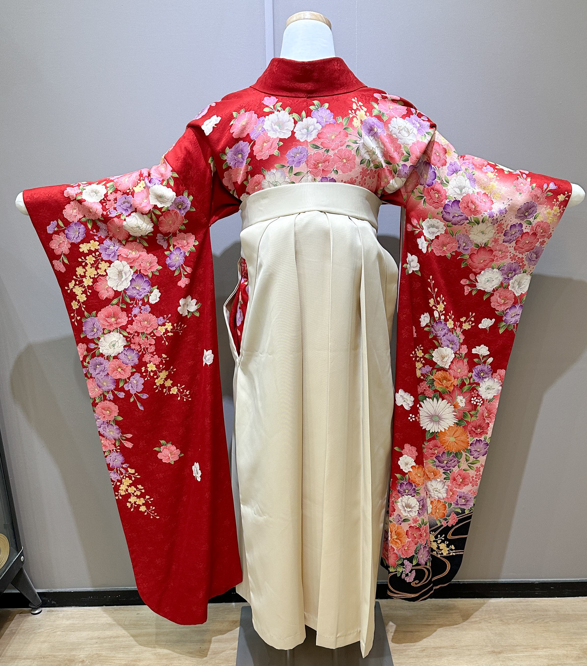 赤をベースに菊や芍薬などの花々がたっぷり描かれたF-43にアイボリー袴でキュートな印象にコーディネートしました。