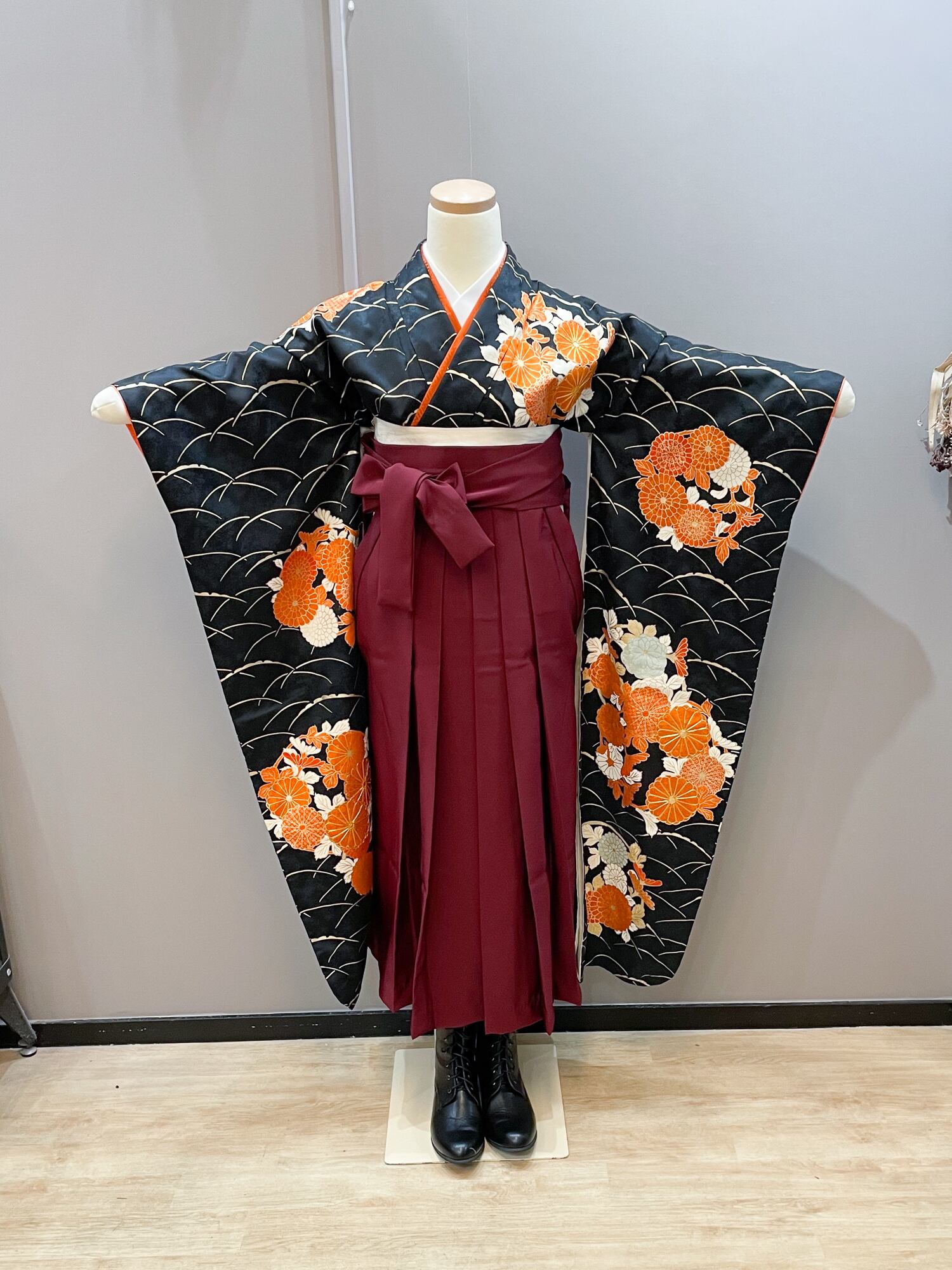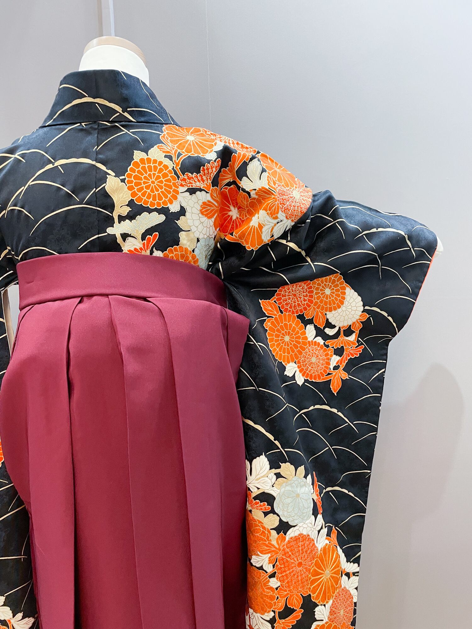 モデル着用のオレンジ袴以外にも、えんじやアイスブルーなど、コーディネートの自由度が高いのも特徴です。