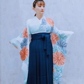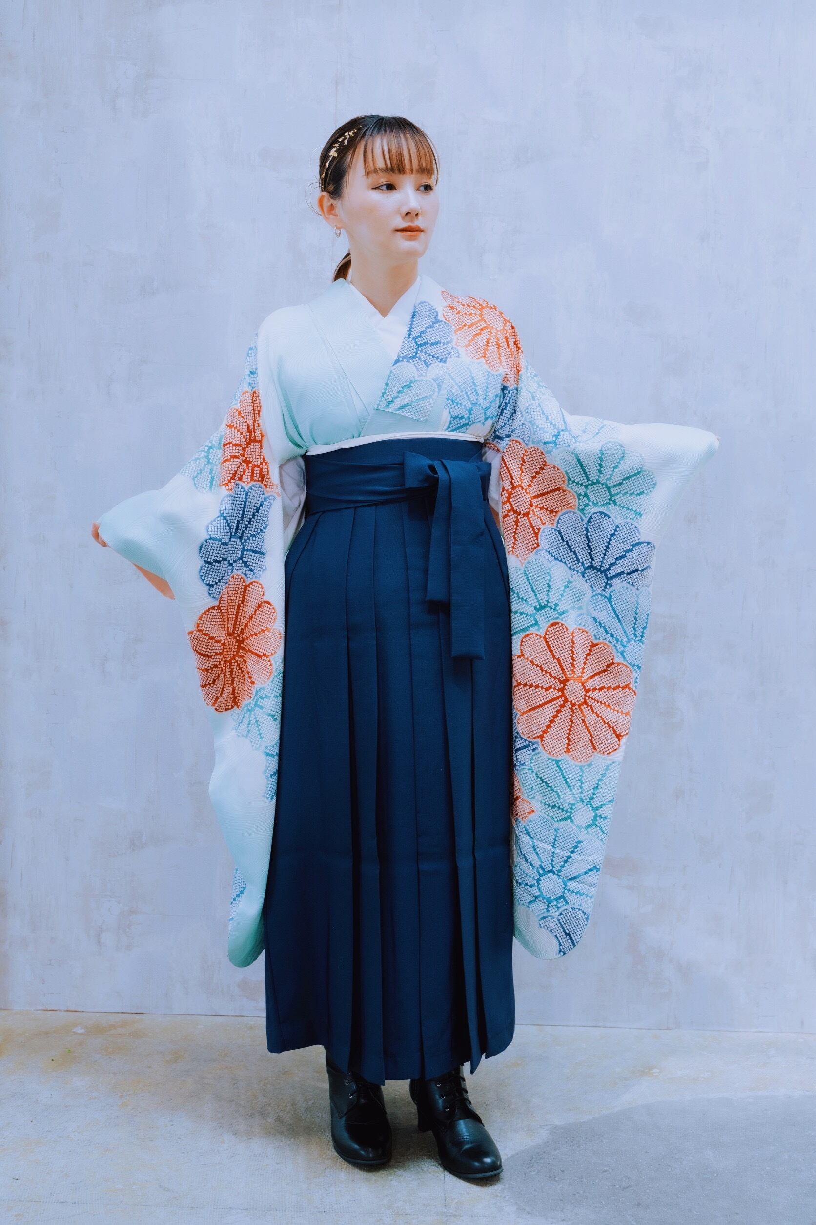 淡いミントグリーンをベースに菊の花が重なるように描かれた比較的シンプルな正絹振袖F-34には、ネイビー袴が相性抜群。